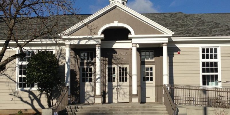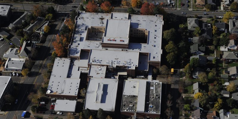 Work included re-roofing of the main school building with SBS roofing materials and rigid insulation, replace skylights and roof hatches, replace gutters and downspouts, raise weeps in existing brick cavity walls to accommodate new roof level, fill in existing roof access door and install new roof over access well, replace existing ladder and add new roof ladders, raise existing window and door sills to accommodate new roof level, replace windows and doors, raise parapets and perimeter walls of some roofs to accommodate new roof level, remove brick chimney, install new ADA compliant handrails, install new ADA compliant lever handles on doors.